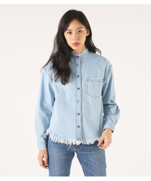 【CUT OFF COLLARLESS DENIM SH】cut offされたバンドカラーデザインと、裾のフリンジが印象的なデニムシャツ。DENIM on DENIMであわせても可愛い。加工にこだわった1枚です。[/ 品 番:0109SH30-0170 素 材:コットン100% カラー: BLU・D/BLU サイズ: F [/