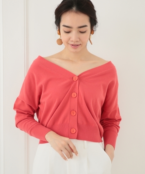 涼感のあるハイツイスト糸を使用した ドルマンスリーブニット。 春から夏にかけてオススメの爽やかな素材感で、 肌離れ良く美しいシルエットを保ちます。 ドルマンスリーブで抜け感あるシルエットが魅力的なVネックカーディガンは ジャストウエスト丈なので、プルオーバーとして使う着方がオススメです。 首元を左右に広く抜いて、鎖骨見せすればいつものVネックカーデも旬顔に。 ぜひこの着方もトライしてください☆ ※画像のボタンはサンプルのため、詳細画像内のボタンに変更されます。 ご了承くださいませ。