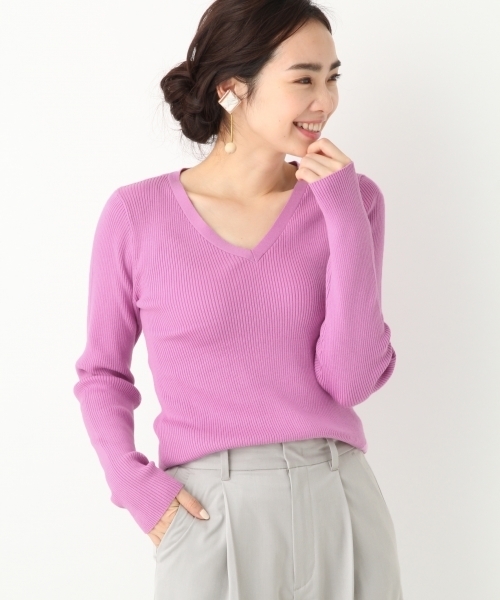 シンプルな細リブニットはVネックで仕上げることで、顔回りをすっきりさせ全体をシャープに見せられる着やせ感抜群の1着。着心地の良い柔らかい素材で気になる背中のシルエットもきれいに見せてくれます。トレンドのボリュームスカートやワイドパンツとはもちろんこの春人気のルーズなデニムと合わせてさらっと着るのもオススメです。