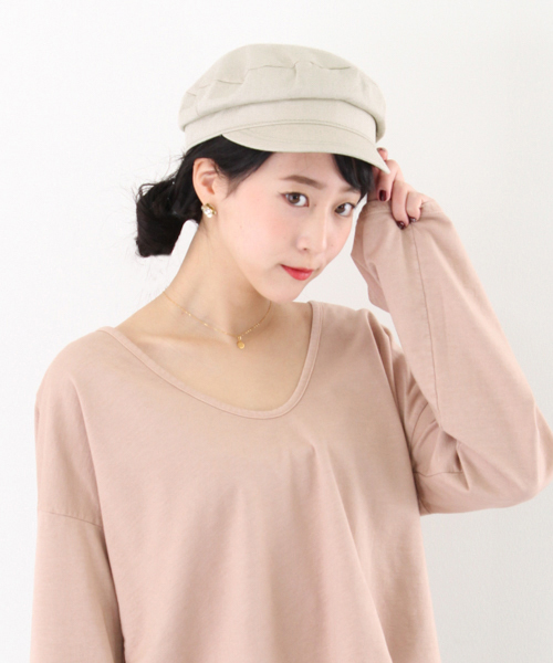 今シーズンのムードにピッタリなキャスケット。これからの季節にピッタリな軽い素材感で、いつものスタイルにプラスするだけで旬なコーディネイトの完成です! ※この製品は素材の特性上、水分や汗、摩擦などにより色落ちすることがありますのでご注意ください。