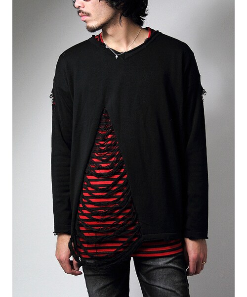リアルダメージ加工がされたニットからボーダーのカットが見え隠れする、インパクト大のカットニットは注目を集めること間違い無しの一点だ。一緒に着用することは勿論、別々でカスタムをして自分好みに着ても◎ カラーはホワイト、ブラックの2色、サイズはM〜Lの2サイズで展開中。 ※()内はボーダーカットソーの寸法となります。 ※ボーダーカットソーは前身頃の着丈が短くアシメントリーになっており、サイズ寸法は後身頃の着丈を記載しています。