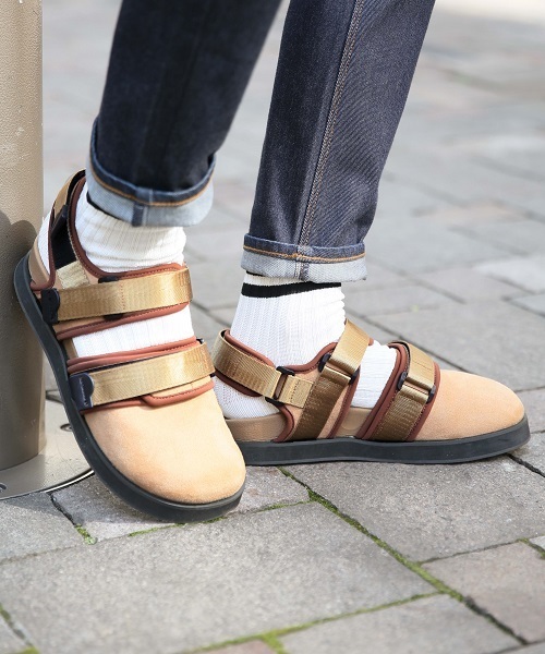 ★スニーカーのような履き心地★ 指先をしっかりと覆ったデザインが特徴のサンダル。 厚めでクッション性のあるソールと、甲とかかとをしっかりとホールドするストラップでフィット感のある履き心地。 ソックス合わせにぴったりで、ぽってりとした形がどこかかわいらしく特徴的ですが落ち着いたカラートーンでカジュアルなスタイルに馴染みます。