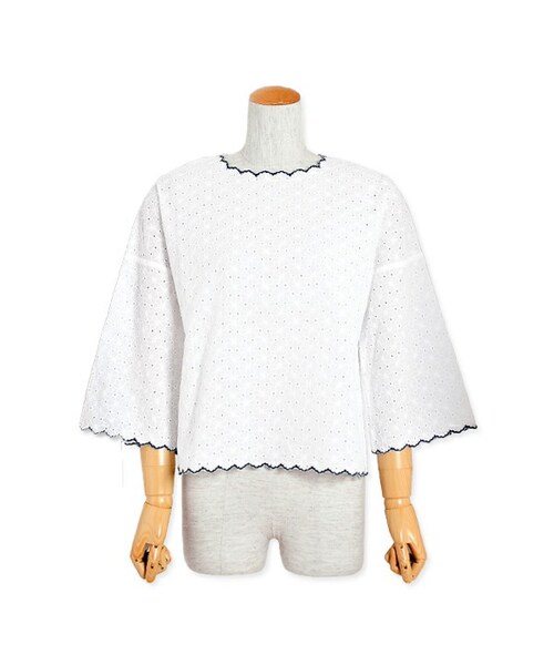 気持ちのいい柔らかなコットン素材の花柄カットワークレース生地を贅沢に身頃全体に使用。 衿、裾、袖に施した、スカラップ刺繍が、他のレースブラウスと差をつけたデザインポイント! またスカラップの大きさも、大きすぎず、小さ過ぎない丁度良いサイズにこだわりました。 カラーはモノトーンカラーにすることでレース素材で華やかだけど、甘すぎない印象に仕上げました。 袖のドロップショルダーに手首が見える袖丈なので、抜け感もあり、アームラインを華奢に見せてくれる効果あり! 合わせるボトム次第で、オフィスにも、カジュアルにも、合わせられる一枚です。