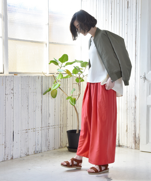店頭配布カタログ掲載アイテム-days-裾にかけて広がるスカートの様な女性らしいボリューム感に、動きやすいパンツの要素を合わせたロングスカーチョ。しなやかさが特徴のレーヨン混の素材を使用し、艶感を抑えた微起毛の質感と軽さのある素材で仕立てているので、春先の重量感のあるニットやアウターと合わせても春らしい着こなしを先取りできる、季節感のあるおすすめの1枚です。落ち着いたベーシックカラーと、明るく華やかな印象のピンクはトレンド感も抑えたパッと目を惹く新鮮さが魅力です。■広がり過ぎないワイド感と、腰周りの深めなタックですっきりとした上品パンツ。 長いシーズンコーディネートできる軽やかな素材感。
