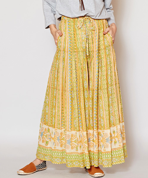 インドの伝統技法・ブロック(木版)プリントのワイドパンツ。ナチュラルな綿麻素材と柔らかな色彩でコーディネートを華やかに彩ります。 ※こちらの商品は1点1点職人による手作りとなります。その為、生地の取り方により柄の配置や形・色等、若干異なる場合がございます。あらかじめご了承ください。 Amina Collection Co.,LTD.