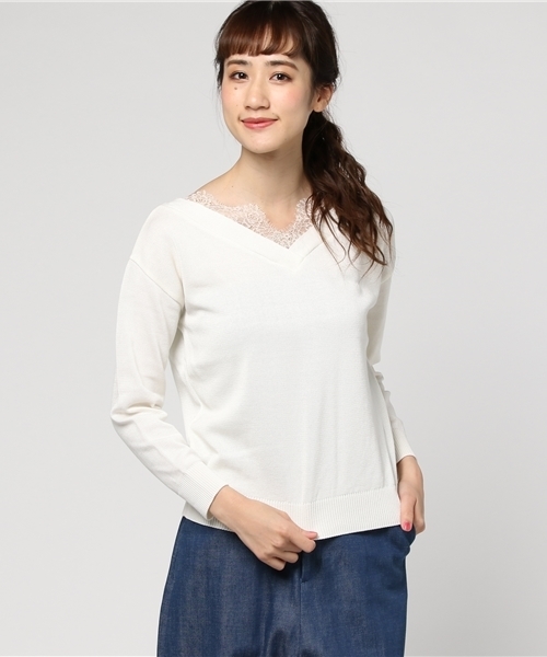 Vネックの内側からちらりと見えるようにレースを施した春ニット。 冬から続くトレンドのレースちら見せは春も続きます。 レースは女性らしい繊細なナイロンレース。 きれいめスカートやスカンツとの合わせがオススメです。