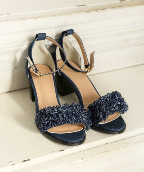 ボリュームのあるフリンジがポイントのヒールサンダル。 甲が広く開いているので足がキレイに見え、パンツスタイルに合わせると女性らしさがグンと増します! キレイに見えるだけでなく、歩きやすさも兼ねそろえたヒールの高さに仕上げました。 さらに、かかとと中敷にはクッションを入れて疲れにくくするよう、機能面もごだわりました。