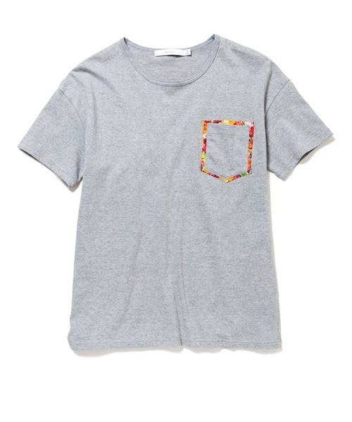 無地のポケットと花柄タイプのポケットが重なるように2層になっているカットソーです。【シルエット】 肩線を落として袖口が広がらずフィットするように工夫しています。 ドロップショルダーなので肩が張らずユニセックスで対応出来るシルエットパターンにしております。【生地】厚みを持ちながら柔らかい肌触りも併せ持つ日本製のオリジナル20/-天竺生地を使用しています。日本生地、日本縫製の完全日本製のアイテムになります。