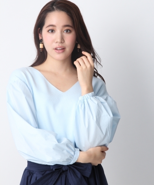 ニットとシャツの異素材組み合わせがかわいいニットが登場!! 袖部分がシャツ素材になっており、トレンド感あるボリューム袖がポイント 深すぎない、適度な空き具合のVネックでON OFFに対応できるアイテム。
