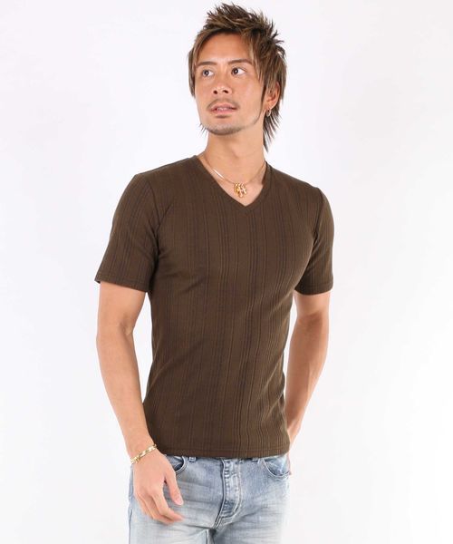 1枚は押さえたいカッコイイ素材感のTシャツ!! 1枚で着てもサマになるのがカッコいいTシャツの条件!! こちらはランダムなリブ編みがとっても表情豊かなスッキリTシャツ。 程よい深さのVネックがとてもエレガントな雰囲気です! 伸縮バツグンなリブ編みだからタイトで細身のシルエットが実現!! また、ハードな洗濯でも型崩れしにくいポリエステル混紡の糸を使用してるからヘビロテにもばっちり!! 様々なシ-ンで使えるコ-デ力抜群の1着を是非お試しください!!