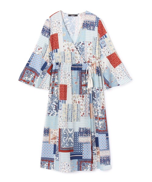 パッチワーク風のクロスがノスタルジックなワンピース。ガウンとしても着回せて、春のコーディネートの幅が広がります。