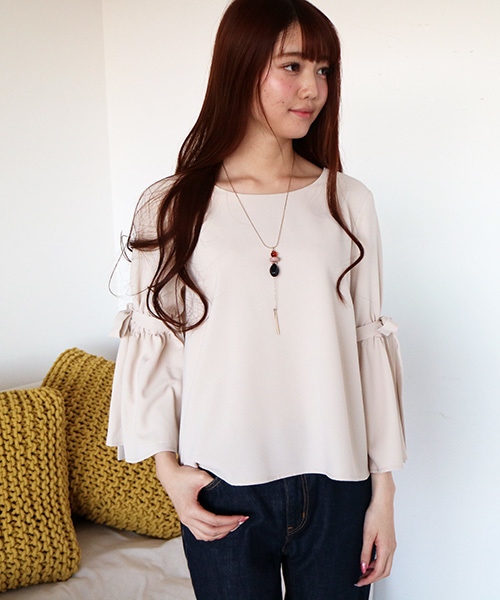 トレンドのフレアスリーブブラウス!フレアスリーブの途中をぎゅっと引き締め、リボンを結んだ可愛さが魅力。前後に開いたラウンドネックで顔まわりスッキリするので、ボリュームスリーブとのバランスが上手なデザイン。大人見えのする上品素材や色展開はN.ならではの気の利くポイント。デニムでカジュアルダウンしたり、シンプルボトムやラインパンツなど、旬な着まわしを楽しめます。