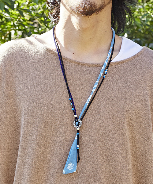 インディゴ色の生地とガラスビーズ・メタルモチーフを組み合わせたハンドメイドのネックレス。カジュアルコーデのアクセントに◎メンズはもちろん、ユニセックスで使えるデザインです★ ※こちらの商品は1点1点職人による手作りとなります。その為、形や色合いなど若干異なる場合がございます。あらかじめご了承ください。 Amina Collection Co.,LTD.