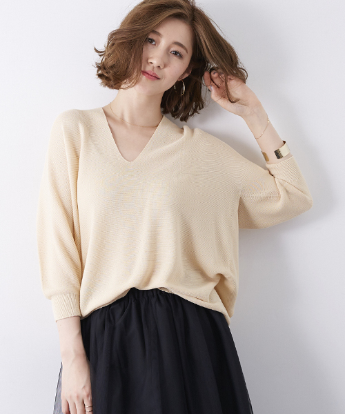 ◆360度自信を持てる優秀ニット◆ ホールガーメント製法で立体的に編み上げたVネックニット。 少しゆっためのコクーンシルエットで後ろに抜け感が出るこなれた印象の一枚。 Vネックの程良い開き具合は顔まわりをスッキリ見せてくれ、女性らしさも演出できるこだわりのシルエット。 細身ボトムからワイドパンツやロングスカートまで幅広いボトムと着まわしできる、万能な一着。