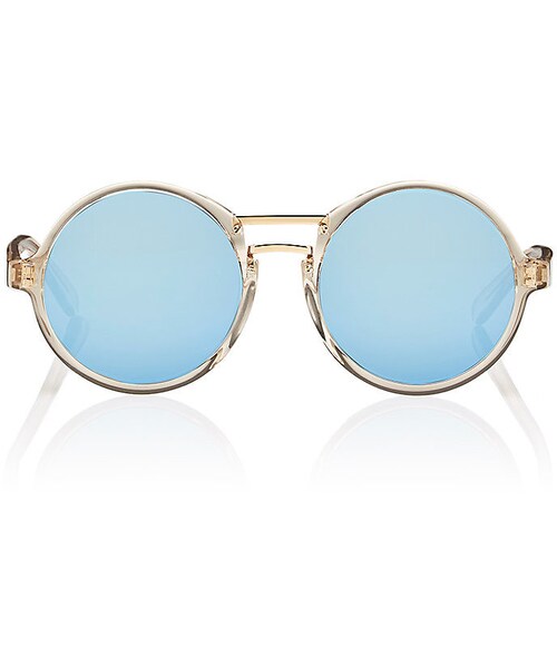 Finlay & Co.'s Draycott sunglasses are handcrafted of champagne fine Italian Mazzucchelli acetate styled with a polished goldtone metal double bridge. Handmade. Round shape. Pin details at metal double bridge. Transparent nose guards. Blue mirrored lenses. UVA/UVB protection. 53mm eye size. 19mm bridge size. 145mm temple size. Available in Champagne/Gold. Acetate, metal. Made in Italy. Includes hard protective case and cleaning cloth.