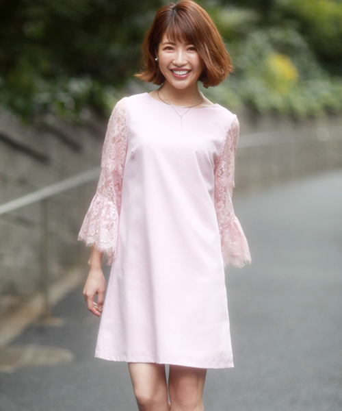 たっぷりとボリュームのある総レースの袖が女性らしさを演出。上品な素材感を使用し、普段使いはもちろん結婚式や二次会、パーティーシーンで大活躍してくれそう。Vにあいた背中には揺れるチェーンがつき、バックスタイルにも抜け目ないワンピースです。