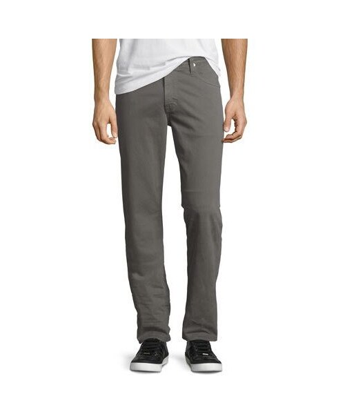 AG Adriano Goldschmied Graduate fit Sud jeans; sueded stretch-twill. Approx. measurements: 11.1" rise, 33.5" inseam, 43.4" outseam, 16" leg opening. Tonal topstitching. Five pocket style. Slim straight legs. Leather logo patch at back waist. Button/zip fly; belt loops. Cotton/spandex. Imported of Italian material.