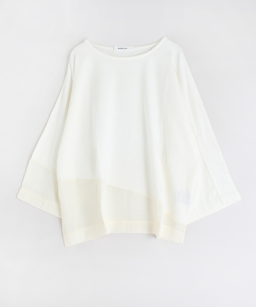 ビッグTシャツ感覚でゆったりと着用できるプルオーバー 落ち感のある素材を両面使いし、光沢のある別布とコンビにしたデザイントップス。アシンメトリーな切り替えを入れ、表情に変化を付けました。 ゆったりとしたリラクシングな着心地が魅力。肌寒い季節は、レイヤードスタイルもお楽しみ頂けます。 ※実際の商品と仕様、加工、サイズが若干異なる場合がございます。