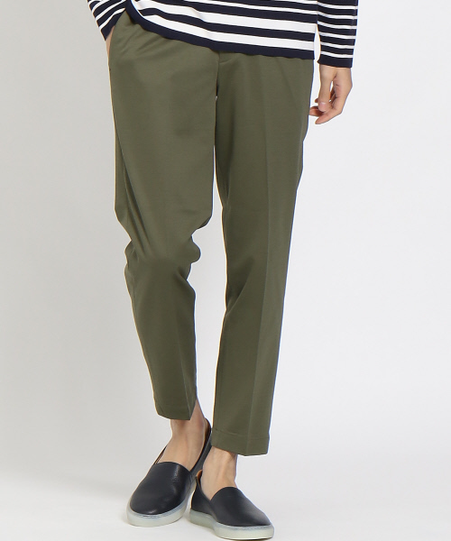 豊富なカラーバリエーションが魅力なイージーパンツ 【素材】 程よい光沢感が特徴の生地を使用。しっかりとした生地感です。 【デザイン】 テーパードのすっきりとしたデザインです。丈感はお直しをせずにジャストサイズ、アンクル丈で着用いただけます。ウエストは紐仕様。 【コーディネート】 ジャケットスタイルはもちろんのこと、カジュアルにも合うアイテム。デニム感覚で取り入れて欲しいアイテムです。
