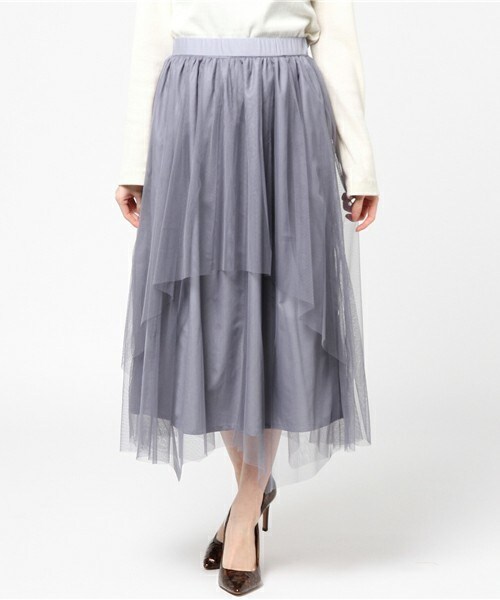 トレンドのチュール素材のアシメSK ストンと広がり過ぎないフレア感が大人にも可愛くなりすぎずに、綺麗に着れるシルエットです。 タイツにニット合わせですぐに着れて、 夏もロゴT合わせでDIORのコエレクションのようなカジュアルかつLADYな着こなしもできます。