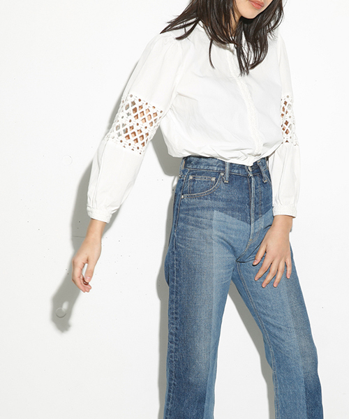 クロップド丈でレトロな印象のTOPSは、袖口と首元にはオリジナルの大振りなフラワーモチーフのカットレースを施していて、VINTAGE感のある雰囲気に仕上げたのもこだわりです。デニムで合わせるのがおすすめです。