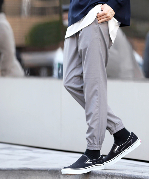 【SamuraiELO 6月号掲載商品】【FINE BOYS 6月号掲載商品】ストレッチ性のある素材で仕上げたジョガースラックス。太腿周りに程よい緩さを持たせたテーパードシルエットで、足元をスッキリと見せてくれるひと品。ウエストはひもで調節可能なゴム仕様にすることで、リラックスして快適に着用頂けます。シンプルなデザインで、幅広いコーディネートに合わせて頂けるのも特長。今季はベレー帽やスニーカーなど、小物で遊びを効かせたコーディネートもオススメです。