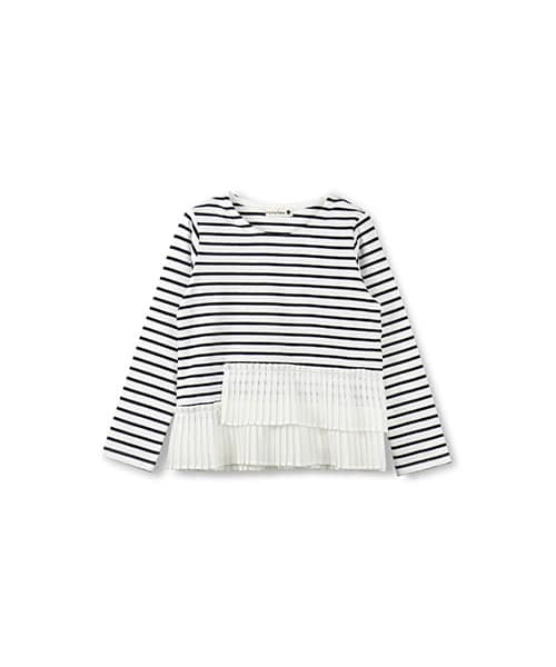定番のボーダーに裾部分が二段プリーツ仕様になった長袖Tシャツです。1枚で存在感もあって、ちょっと大人っぽいデザインがポイントです。※80cmから90cmは、首もとがスナップボタン仕様となります。