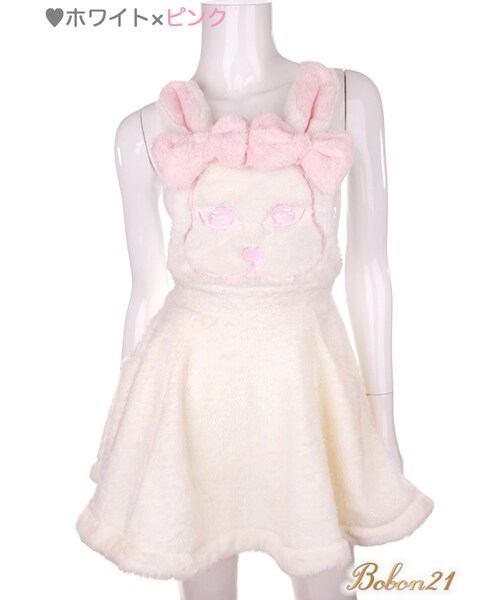 ♡Bobon21 2016AW New Collection♡ モコモコで萌えなうさぎジャンスカが新登場 フロント部分フェイクファー素材、キュートなうさぎの顔になっていて、肩にかけて立体的なうさ耳とリボンで萌えきょんなデザイン スカート部分は、起毛素材になっていて、裾にはも、フロント部分と同じフェイクファーをつけてるよ♪さらに、後ろには大きなしっぽが付いてるよ❤ カラーは、ピンクとホワイトの2色展開