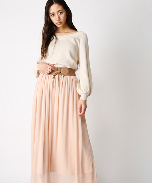 ウエスタンライクな合皮のレースアップベルトと、シフォンスカートをドッキングさせたデザイン。透け感のあるシフォンスカートは揺れるシルエットが女性らしく、カラーも春らしいオフホワイトやベージュの展開が目をひきます。TOPSはインしてベルト部分をスタイリングのポイントにするのがオススメ。一癖あるデザインがMOUSSYらしいスカート。