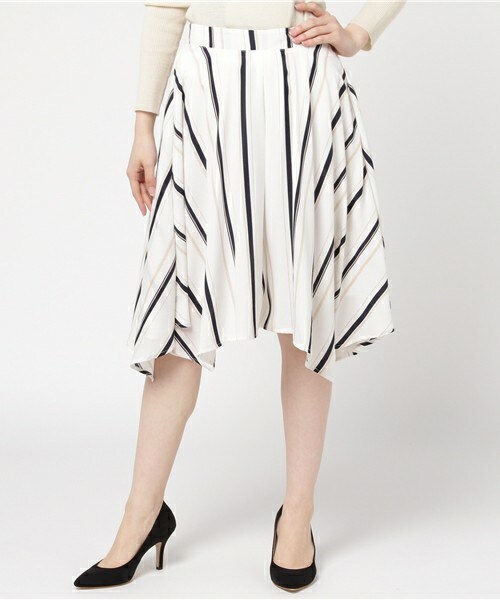 動きのあるデザインのサーキュラースカート ストライプ生地をランダムに使い、 ウエスト部分はすっきりしていながら裾回りがゆったりとしてフレアが入って広がりがある型、 着用時のラインが美しいスカート。 柔らかい生地で動きがあるのでエレガントさのなかに女性らしさやかわいさを演出でいます。 ニット~ブラウス・カットまでシーズンレスに着用できる生地感です。 裏地有りです。
