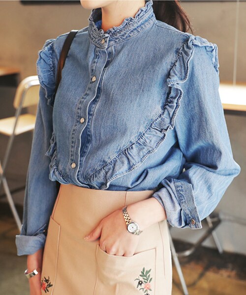 カジュアルなデニムシャツに可愛らしいフリルをあしらいガーリッシュに♡春秋のスタイリングに便利な一着^^首元はしっかり閉めて着用するのがオススメ! ※WEARに記載してある金額と、DHOLIC通販サイトに記載してある金額にシステム都合上、稀に誤差が生じます。正しい金額はDHOLIC通販サイトに記載された金額です。