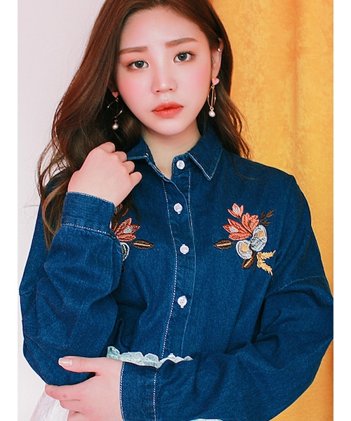 バストのフラワー刺繍で顔色を 明るく見せてくれるブラウスです。 シャツスタイルで大人チックな スタイリングにも便利に対応します! ボリューム感で愛らしさの一味もプラス デニム素材のカジュアル雰囲気に刺繍ポイントで エレガントなムードもプラスしたデザインです。