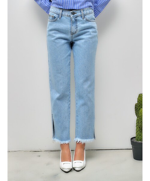ハイウエストから真っ直ぐに ストンと落ちるシルエットで 脚のラインを修正してくれます。 コットン地の丈夫な仕上がりに、 裾のフリンジポイントはナチュラルで今年っぽいです。 サイドのスリットで活動性も高めました。
