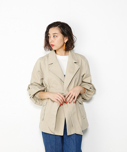 ヘリンボーンのミリタリー素材を使用。ミリタリーというカジュアルでメンズっぽいアイテムを、袖にボリュームを持たせることで女性らしい印象に仕上げたミリタリージャケットは、付属のベルトでウエストマークしてSLIMパンツと合わせるスタイリングがオススメです。