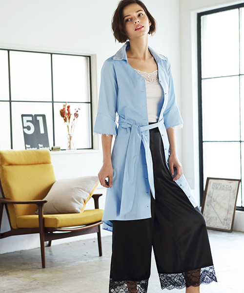 デコルテやうなじがちらりと見える、抜け感ある襟元にレースがあしらわれフェミニンなデザインのワンピース。着丈は前後アシンメトリーとなっており、ハリ感のある素材が綺麗なフレアシルエットも。ガウンのようにで羽織りとしてもお召しいただけて、曖昧な季節感にフィット。膝丈で脚のラインがとてもきれいに見えます。