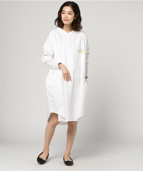 ポケットにつけた、リボンで作られたネコがポイントのシャツワンピース。 スタンドカラーの衿がすっきりとした印象に見える1着。両サイドにポケットがついています。