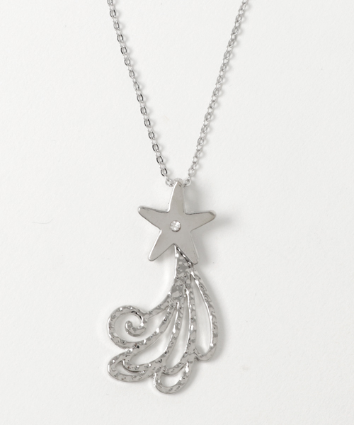 流れ星をモチーフにしたネックレス★動くたびに後のチャームが揺れるデザインになっています。 メタル表面に凹凸・テクスチャーを入れた上品なアクセサリー。大人カジュアルなコーディネートに◎ ※こちらの商品は1点1点職人による手作りとなります。その為、形や色合いなど若干異なる場合がございます。あらかじめご了承ください。 Amina Collection Co.,LTD.