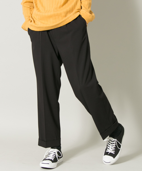 【WEB企画アイテム】高いクオリティーと、優れたコストパフォーマンスを両立させたWEB企画アイテム。サラサラとした素材感と、とろみのあるドレープがエアリーな存在感を生むT/R素材のワイドパンツ。シルエットにメリハリが出るよう、ウエストにタックを入れ、センタープレスで立体感を出しています。レングスは9分丈に設定し、足元に軽やかさを注入。今やスタイリングには欠かせないマストアイテムは、この春夏も手に入れておきたい。