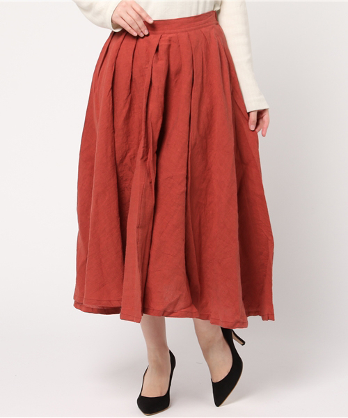 吉備の国(岡山県)で染色職人が昔ながらの手法で1反ずつ丁寧に加工しているリネン素材を使用しています。表面のほどよいシワ感が特徴で、やわらかな風合いも心地よい♪ フレアがもっとも美しく出るサーキュラースカートは、イレギュラーヘムにすることで動きのある軽やかなデザインとなっています。