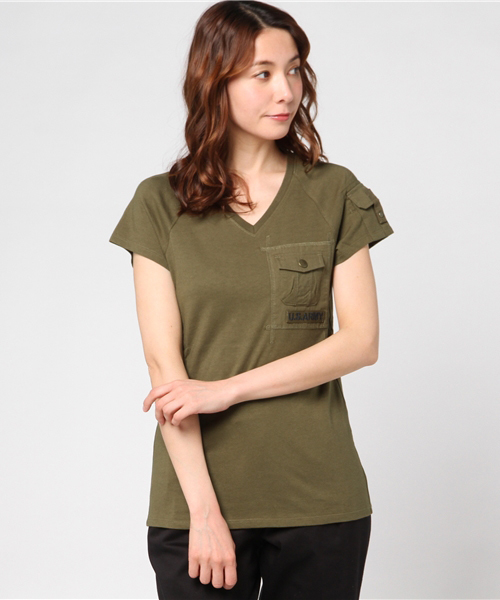 胸と袖に付いたポケットが特徴のティーシャツです☆ ブランドらしい、ポケットをアクセントとして使ったティーシャツです。 1枚でサマになり、シルエットが綺麗です。 肩線にはダーツをわざと入れて、綺麗に肩に沿うようにし、腕が細く見えるようにしてあります。 又、脇の切り替えを前に少しずらしてあるので、着用時、細見え効果が期待できます。 【AVIREX Belle】 本格的なミリタリーウェアが持つ機能性とデザインをレディースカジュアルに投影したライン。 個性的かつ時代性のあるレディースブランドとして聡明、自由、好奇心、凛として快活な 働く大人の女性へ向けたレディスカジュアルを提案しています。 ■お使いのパソコンのモニターによって、実物商品とカラーが異なって 見える場合があります。誠に申し訳ございませんが、ご理解下さいます様お願いいたします。 ■当ショップの在庫数は 直営店舗の商品も含まれています。在庫数が日々変動する為、ご注文頂いた時点で在庫が完売になっている場合がございます。 ■サイズ表は、製品の生地や織りなどの特性により、多少の誤差はございます。予めご了承ください。