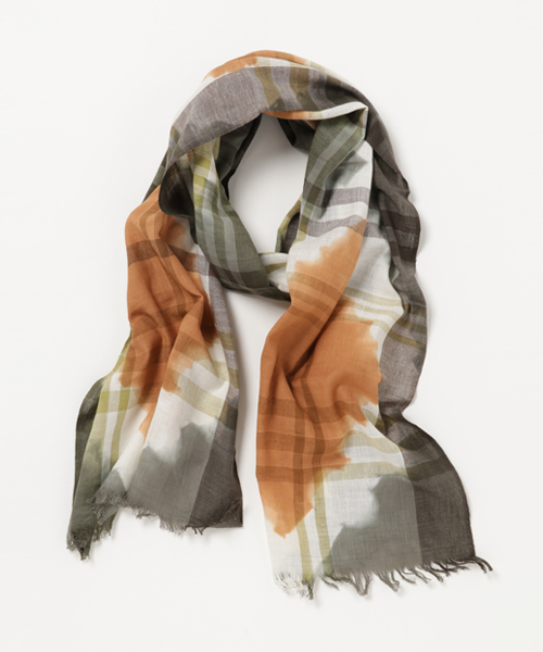 風合いの良いインド綿のチェック柄織り生地をタイダイ染めしたシックなストール。落ち着いた色合いと素材感で大人カジュアルなコーディネートに◎男女兼用・ユニセックスで使えるデザインです。首に巻くのはもちろん、ヘッドアクセサリーとしてターバンのようにボリューミーに頭に巻くのもオススメです◎ ※こちらの商品は1点1点職人による手作りとなります。その為、形や色合い・染め模様など若干異なる場合がございます。あらかじめご了承ください。 Amina Collection Co.,LTD.