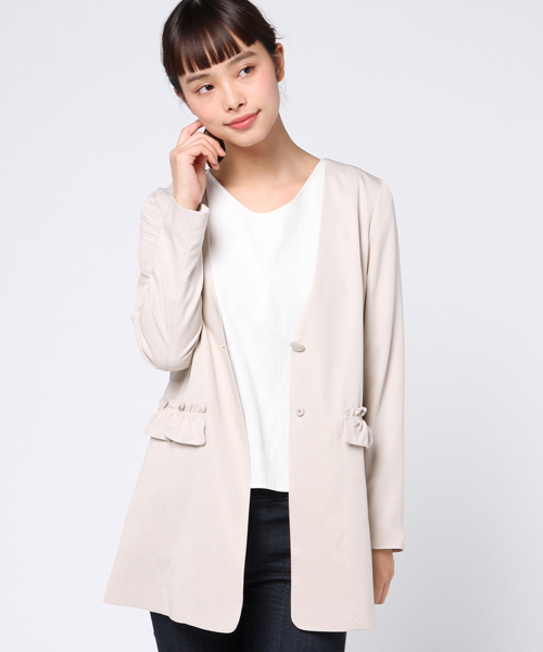 きちんと感とジルバイらしさを覗かせるフリルポケ見せジャケット!スッキリした襟元に、ヒップの隠れる絶妙な着丈でスタイルカバーを狙うデザイン。あらゆるスタイルと相性良く羽織れ、トレンチより軽やかな印象で長く愛用できます。※裏地付き