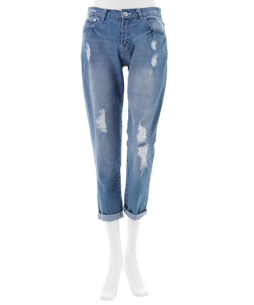 ボーイズライクにクラッシュを施したデニムパンツ♪ ゆったりシルエットで、オシャレ度とこなれ感をアピール☆ ロールアップして足首をすっきりと見せるのがお勧め◎。 ★加工の特性上、カラー・サイズが写真・サイズ表示と多少異なる場合があります。