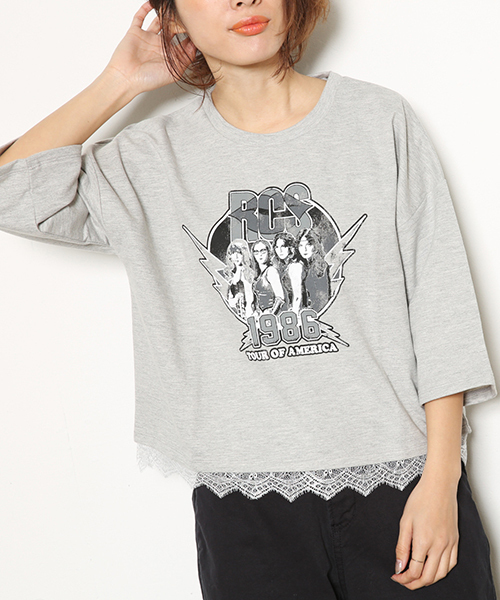 カジュアルなTシャツの裾にレースがあしらわれ、カジュアルとフェミニンが絶妙にマッチした1枚。体がゆるりと泳ぐビッグシルエットで、こなれ感たっぷりに着られるのが◎。ロックな表情を見せる胸元のプリントがエッジィなポイントに。袖のボリューム感もキュート。