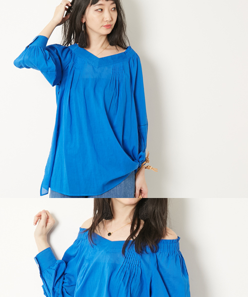 シンプルなルックスながらショルダーで変化を楽しめるブラウス。 透け感のある涼しげな表情がこれからのシーズンにぴったり。 インドコットンを使用しているから、ふんわりした優しい肌触りが◎ オフショルダーで大胆な肌見せも楽しめるから、リゾートや水着の上からサラッと着こなすのもおすすめ。 今年人気のボリュームスリーブ ブラウスです! アメリカンラグシー/207-LAN-B8100