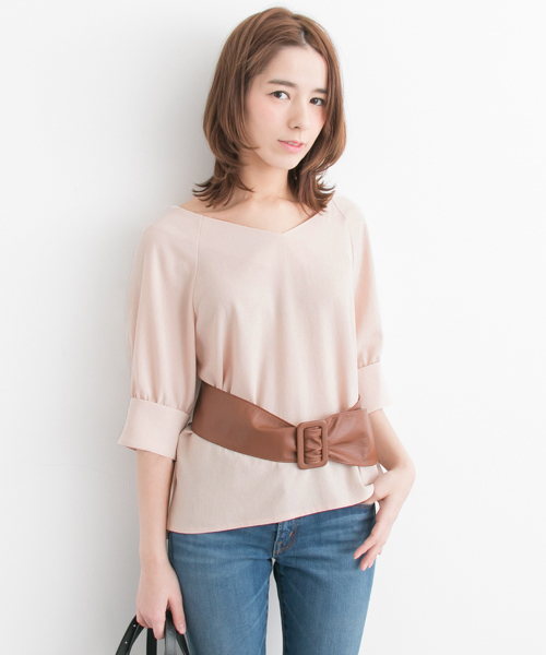 袖口がカフスデザインになったVネックブラウス。 ネック後ろはゴム仕様になっており、オフショル風に肩まで落として今年らしくお召いただく事も出来ます。 また七分袖のお作りが、永いシーズンの着用を可能に。 柔らかなニュアンスカラーが春らしく、同時にどのようなコーディネートにもマッチ。シーンを選ばずオンオフ兼用で着用可能な万能ブラウスです。 ※透け感あり ※この商品は、素材の特性上、直射日光や蛍光灯に長時間に当たると変色や色褪せすることがありますので、ご注意ください。