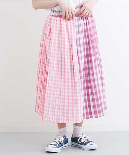 パターン配色違いのギンガム柄がお洒落なスカート。 ゆるっとしたトップスやバンドカラーのブラウスなどと合わせるのが旬なコーデになりおすすめです。裏地有りです。