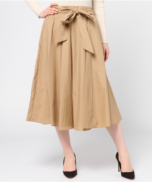 ボリューミーなスカートはそれだけで存在感あり☆程よいシャリ感のある素材です。ウエストには今年注目のリボン紐が付いていてウエストマークして着用して頂けます。明るめの色が欲しくなる季節レッドはインパクト大です裏地有りです。