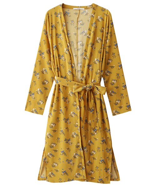 ボディを飾るレトロフラワー柄が、可愛らしいトッパー。 ロング丈デザインで、大人顔に仕上げました♪ ベルトが付属したボタン無しの仕様で、フロントをベルトで締めるスタイリングや、ガウンのようにラフに羽織るスタイリングもオススメ♂ ★裁断の関係で、柄の出方が写真と多少異なる場合があります。