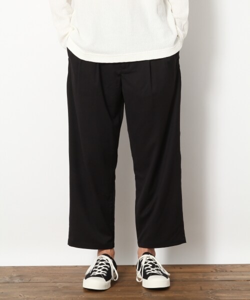 少し短めに設定したアンクル丈のワイドパンツは独特のバランス感が魅力。程よい艶と上質な質感が伺える生地を使用し、ワイドシルエットだけれど品のある、スタイリッシュな1本に仕上げています。ウエストのサイド部分はゴム仕様になっており、パッと見はふつうのパンツなのに楽に穿けちゃう嬉しいデザイン!軽い生地感なのでこれからの季節活躍すること間違いなしです!
